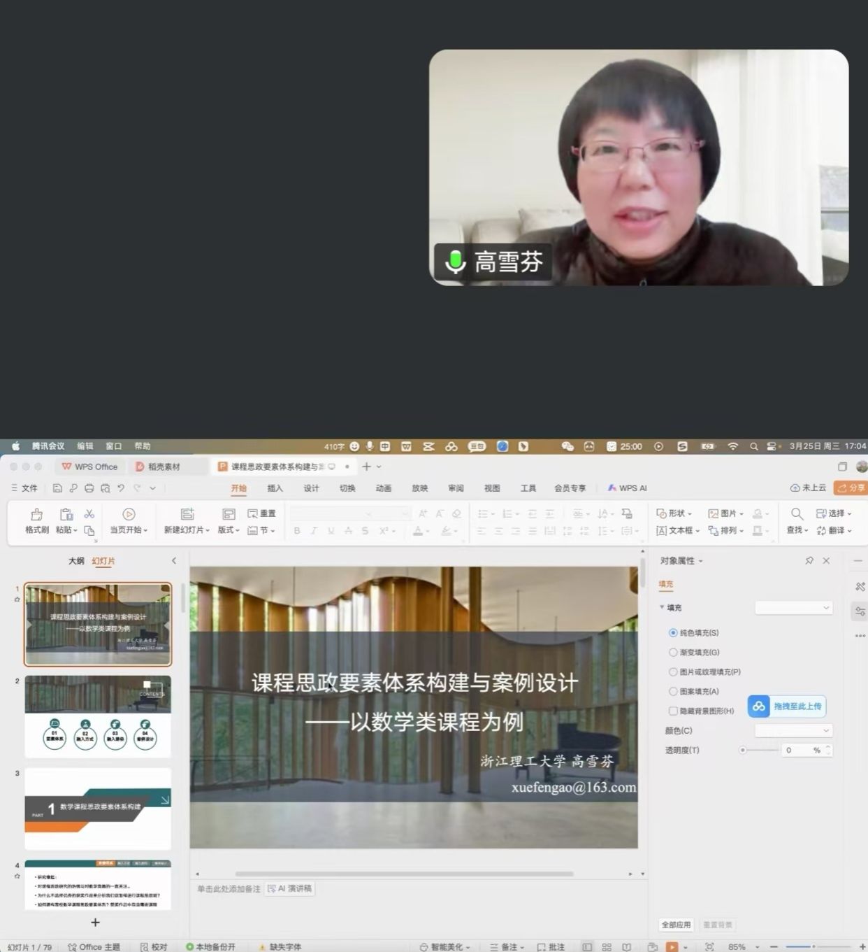 研讨伊始,高雪芬教授介绍了如何以习近平总书记关于课程思政、铸牢中华民族共同体意识的有关论述及国家相关文件要求为基点构建课程思政建设框架,以全国青教赛竞赛视频为样本提出了课程思政融入数学课程的三种主要方式,并以大量的案例介绍了思政融入数学课程的路径。