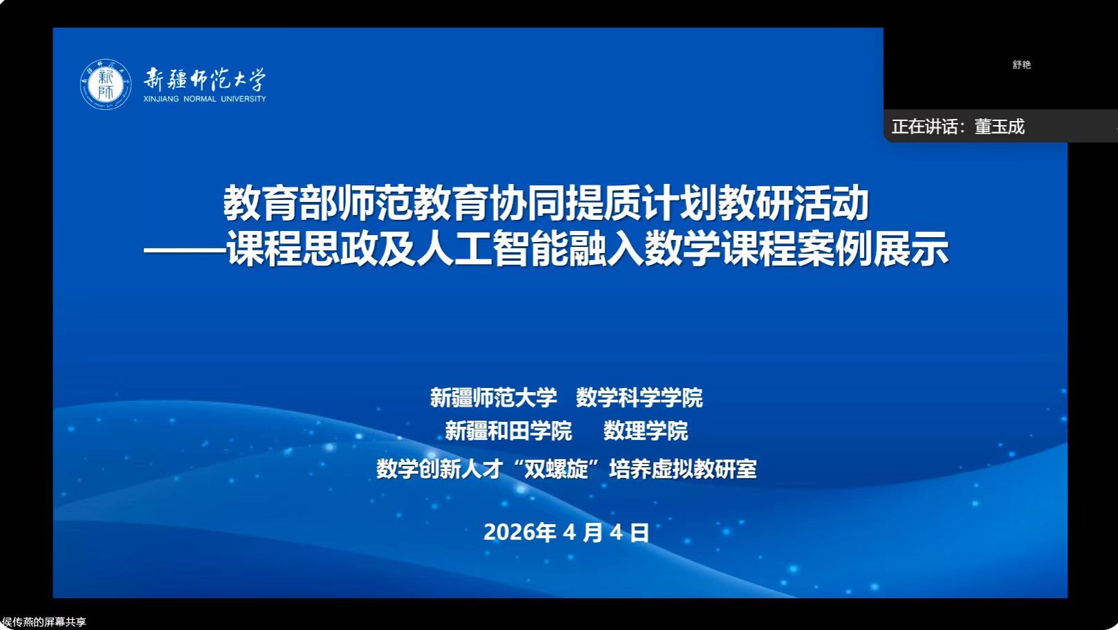为深化数学课程思政和智慧课程建设,提升教学质量与育人实效,经过两周的精心筹备,4月4日,智慧课程+课程思政教学案例线上分享会顺利举行。本次研讨会邀请乌鲁木齐第十三中学、和田世俱杯 和本院教师分享各自实践经验,全体参会人员围绕相关议题深入交流,就后续普及与深入路径达成共识,取得了良好的研讨效果。