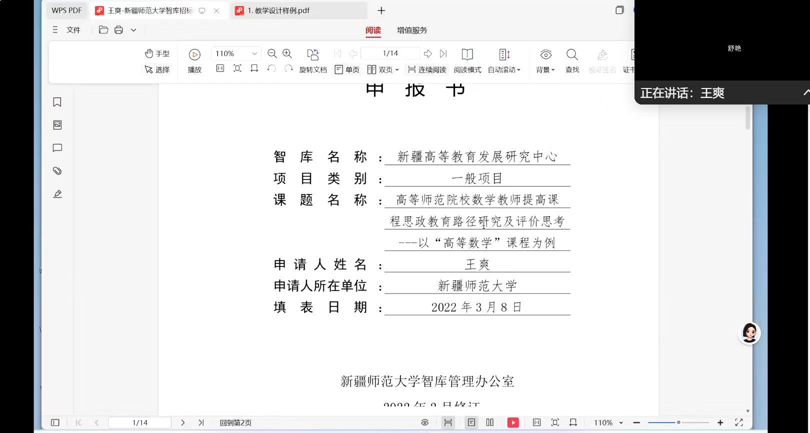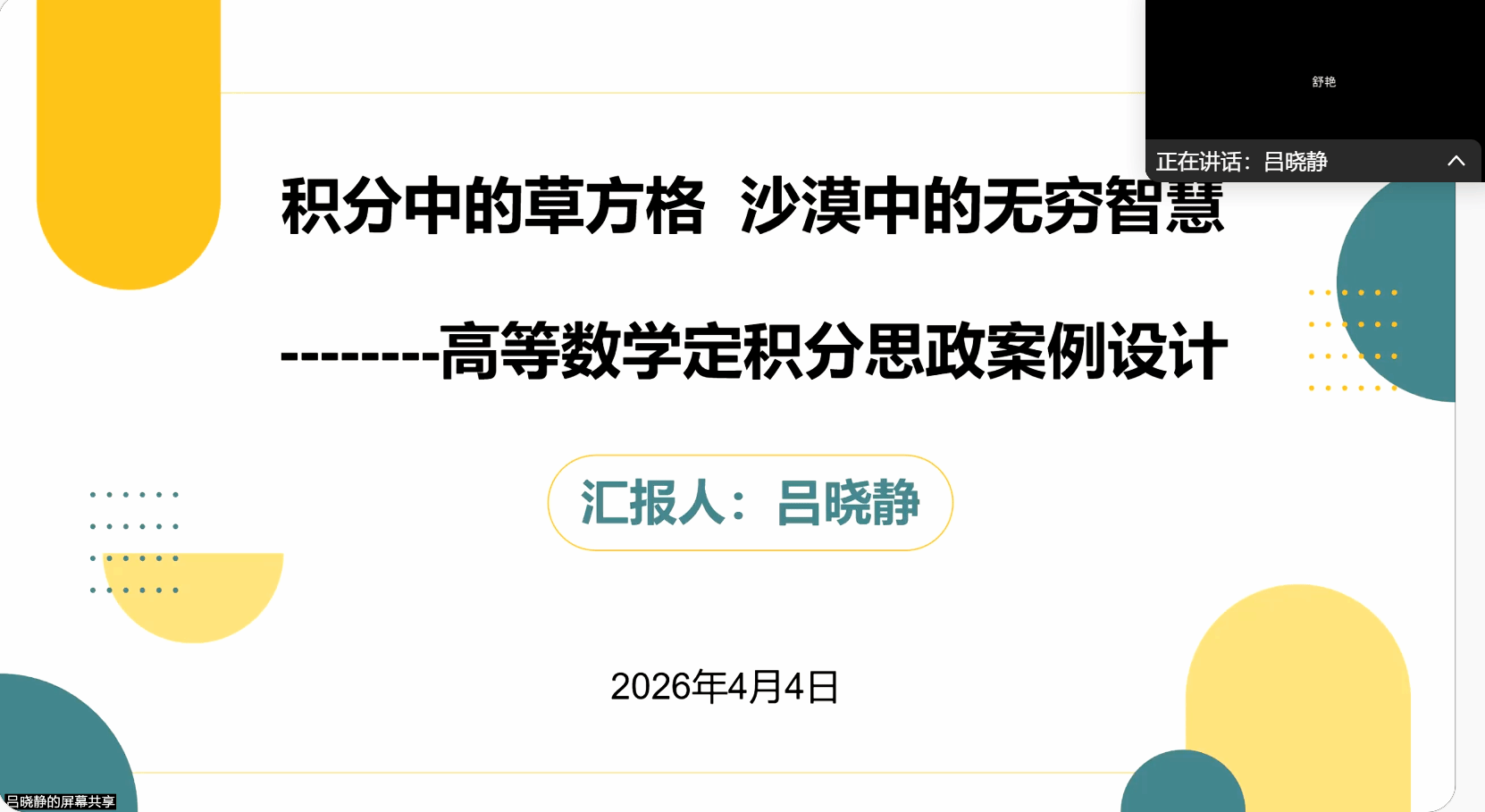 来自和田世俱杯 的吕晓静教授围绕高等数学课程思政深度融合展开分享。她以塔克拉玛干沙漠锁边工程为载体深入探讨了定积分概念的情景教学过程,在数学知识构建过程中深深体会到量变到质变、“绿水青山就是金山银山”的深刻性,体现从大处着眼、小处入手的课程思政设计路线。